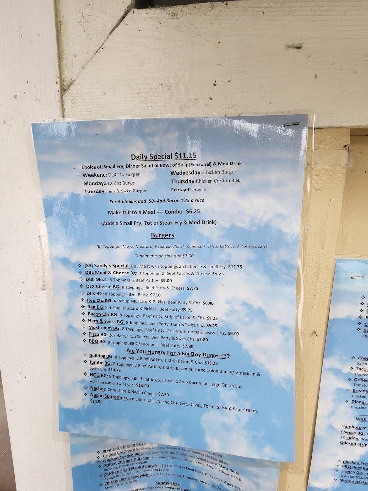 Sandy's Drive Inn offers a diverse menu sure to please everyone. Breakfast items, burgers, and sandwiches take center stage here. Don't miss the breakfast specials, served until late morning. All meals are prepared with fresh ingredients and a homey touch.